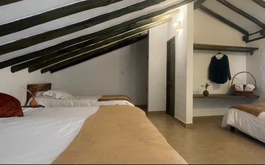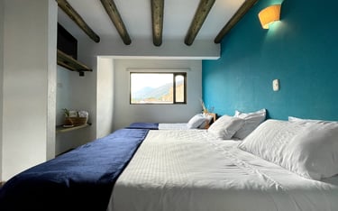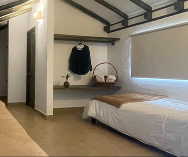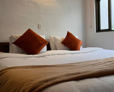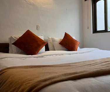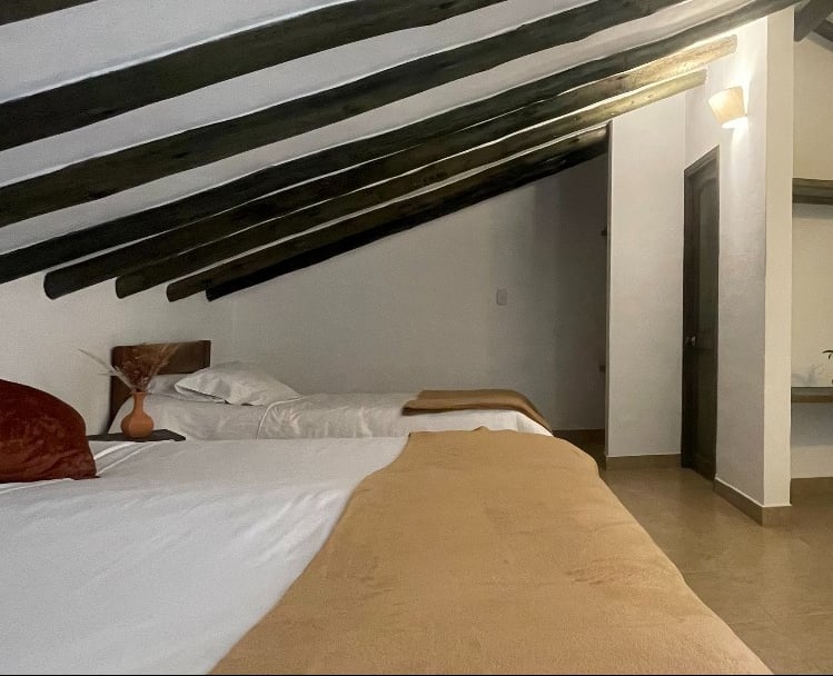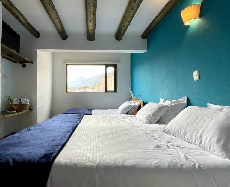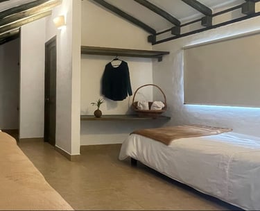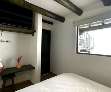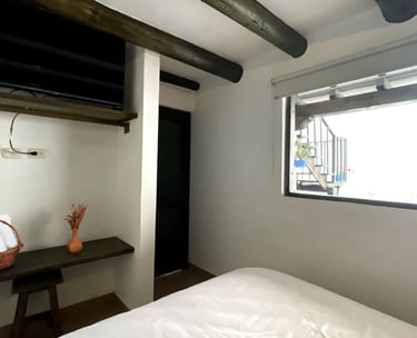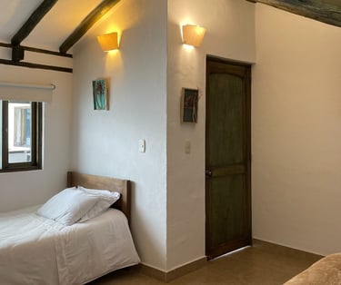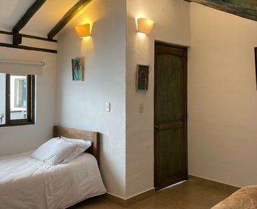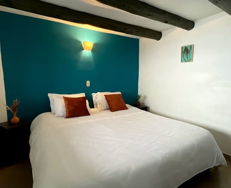 Habitación ideal para parejas, decoración colonial y detalles modernos para una estancia confortable y relajante en el corazón de Villa de Leyva.