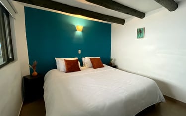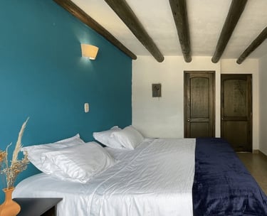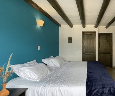 Habitación amplia con cama king, con diseño contemporáneo y detalles coloniales que ofrecen un ambiente íntimo y acogedor para una escapada especial.